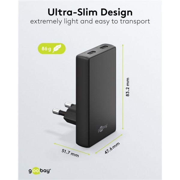 Chargeur rapide 90° 2x ports USB-C 90° 65W noir