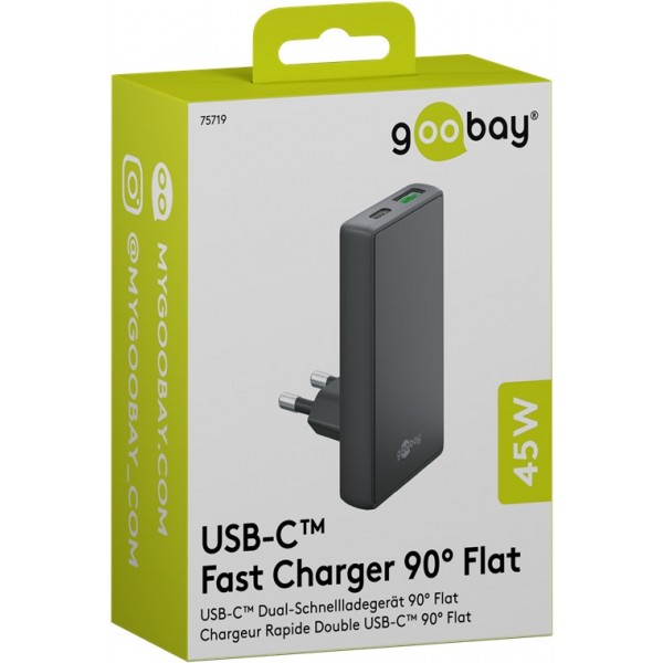 Chargeur rapide 90° 1x USB-C / 1x UBS-A 45W noir