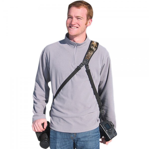 Les 2 appareils peuvent glisser librement de haut en bas le long de la sangle sans s’entrechoquer. Le coussin de sangle en néoprène breveté incorporé offre un soutien et un confort maximal. La surface antidérapante maintient solidement sur l’épaule. Si une seule caméra est nécessaire, les raccords rapides vous permettent de supprimer l'une des attaches rapidement et facilement.