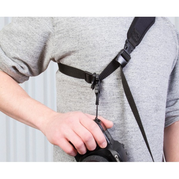 Cette courroie porte les équipements lourds avec un système d'étirement contrôlé interne et est équipée de connecteurs qui permettent de faire coulisser votre appareil dans une nouvelle version plus longue. Elle dispose également d’une boucle qui permet de resserrer très rapidement la sangle au plus serré pour garder votre équipement près de vous.