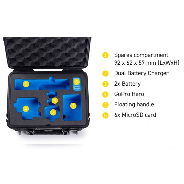 Grâce à son insert en mousse personnalisée, il offre suffisamment d'espace pour la GoPro Hero 9/10/11/12/13 et les accessoires : le double chargeur de batterie, jusqu'à 3 batteries, jusqu'à 7 microSD, des supports de montage et des câbles.