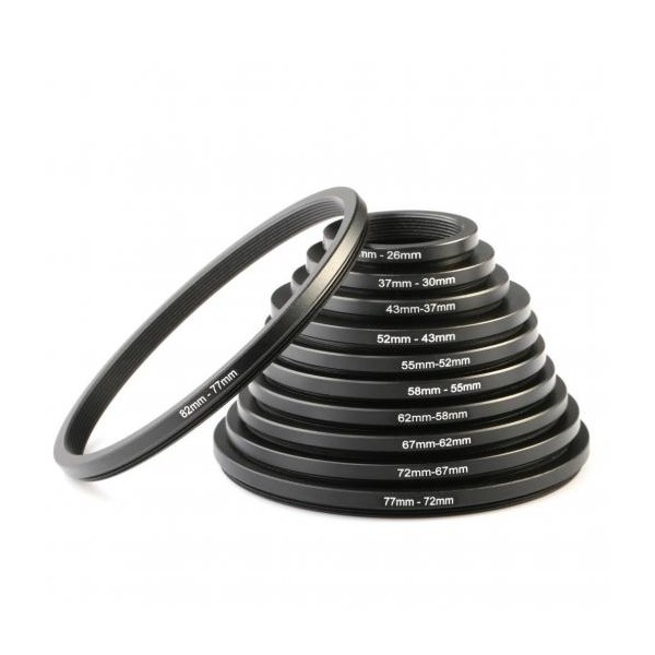 Le kit comprend : Anneau abaisseur générique en métal 11 pièces 30-26 mm, 37-30 mm, 43-37 mm, 52-43 mm, 55-52 mm, 58-55 mm, 62-58 mm, 67-62 mm, 72-67 mm, 77-72 mm, 82-77MM