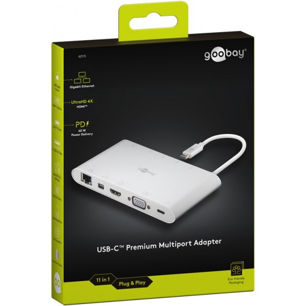 Elargit un appareil USB-C d’une connexion Ethernet, HDMI, VGA et Mini DisplayPort, 3x USB-A 3.0, 1x prise Jack de 3,5 mm et un lecteur de cartes SD et Micro SD.