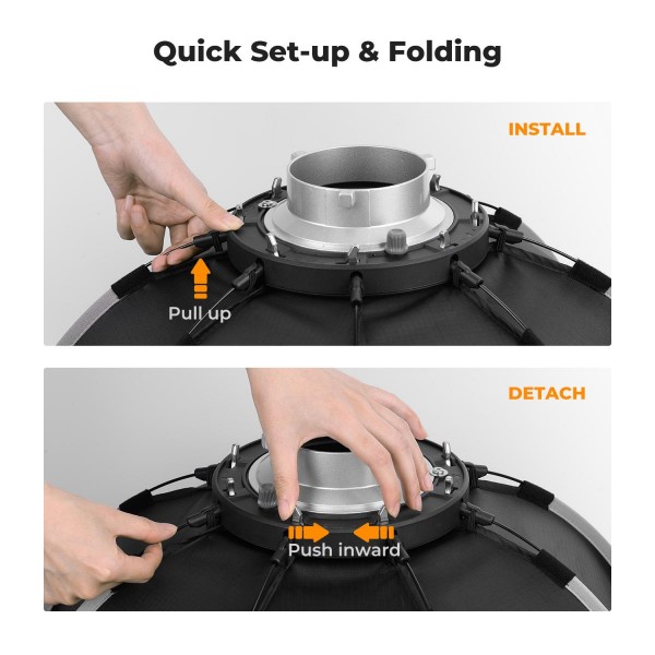 Avec une structure monobloc, la softbox peut être rapidement ouverte et fermée en quelques secondes.