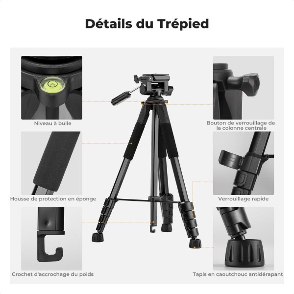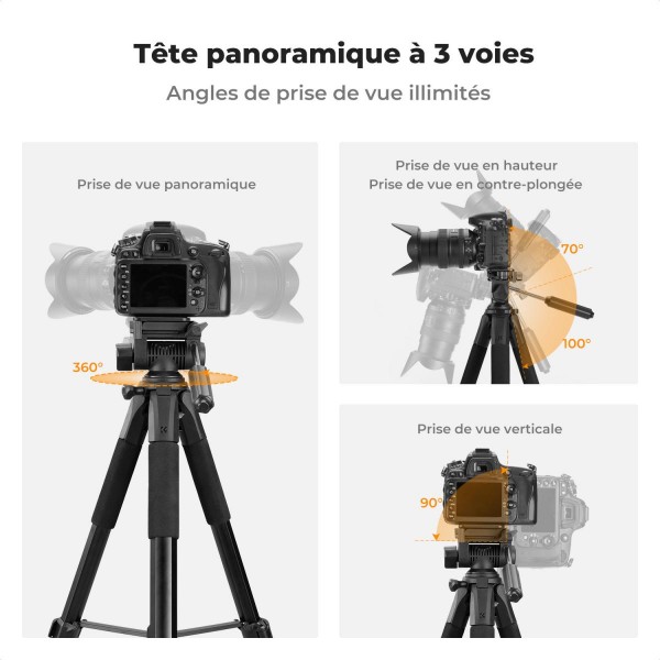 Il dispose d'un niveau à bulle intégré pour l'équilibrage et d'une tête panoramique rotative à 360 ° à 3 voies pour des photos grand angle.